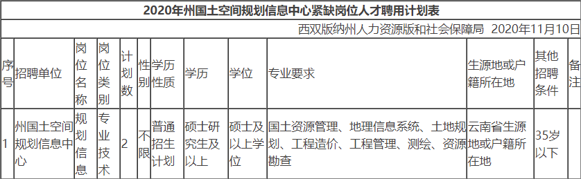 2020西双版纳州国土空间规划信息中心拟面向社会招聘硕士研究生及以上学历工作人员2名(具体条件详见附件1)