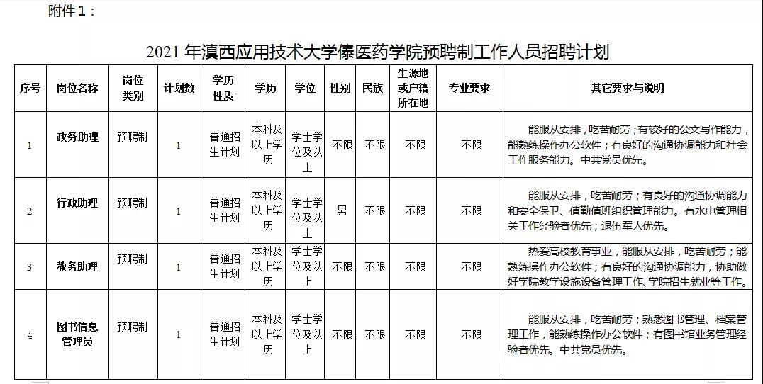 滇西应用技术大学傣医药学院2021年面向社会公开招聘预聘制工作人员4名,其中,政务助理1名,行政助理1名,教务助理1名,图书信息管理员1名。具体详见《2021年滇西应用技术大学傣医药学院预聘制工作人员招聘计划》(附件1)。