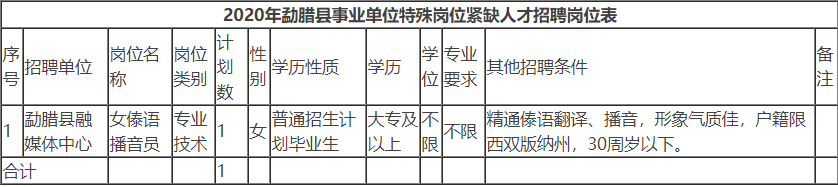 具体岗位、人数、资格条件等详见《2020年勐腊县事业单位特殊岗位紧缺人才招聘岗位表》(附件3)。报考岗位专业需求参照《2020年云南省公务员录用考试专业目录》(附件1)。