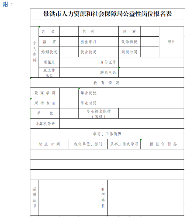 附:景洪市人力资源和社会保障局公益性岗位报名表