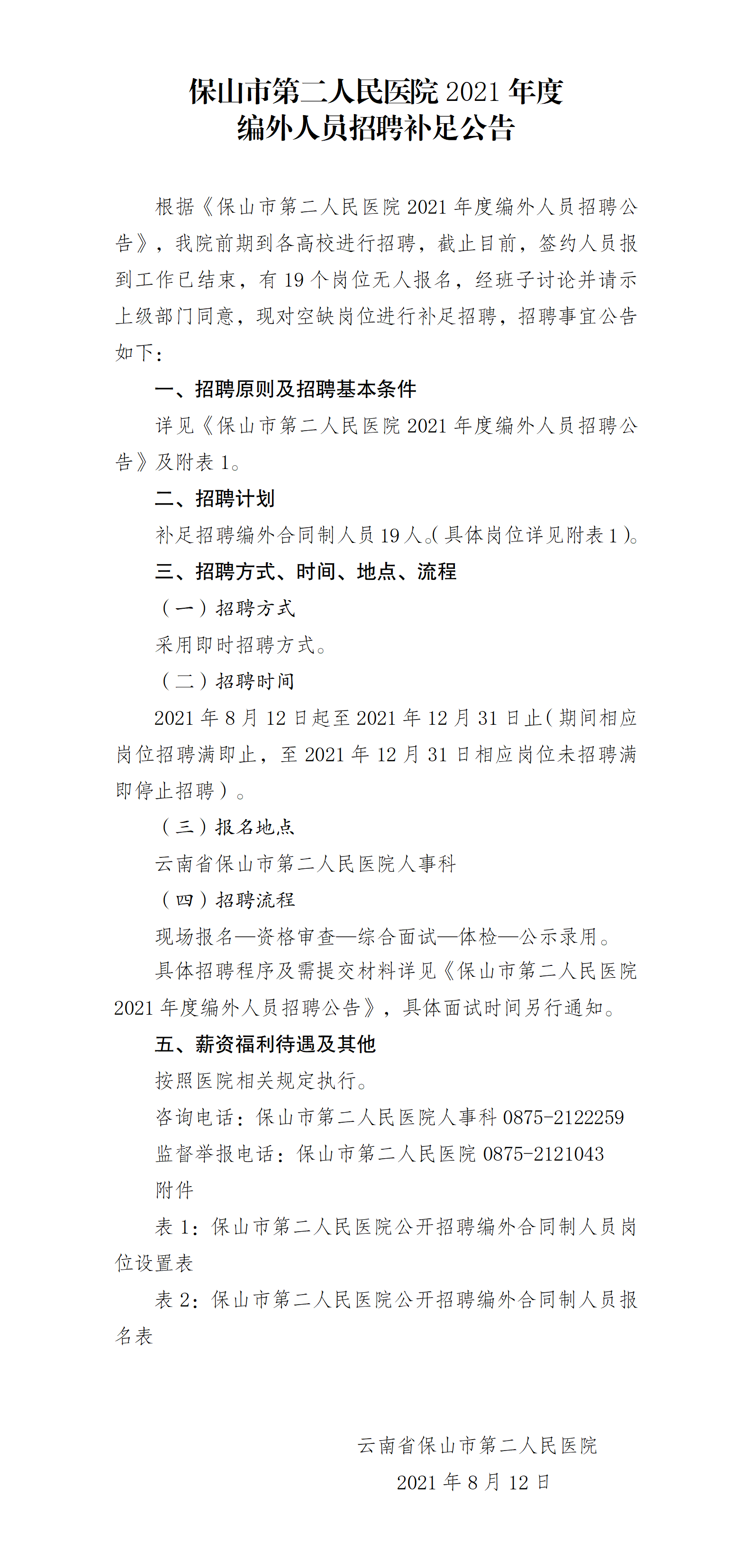 附件1:保山市第二人民医院2021年二次补充招聘编外合同制人员岗位设置表