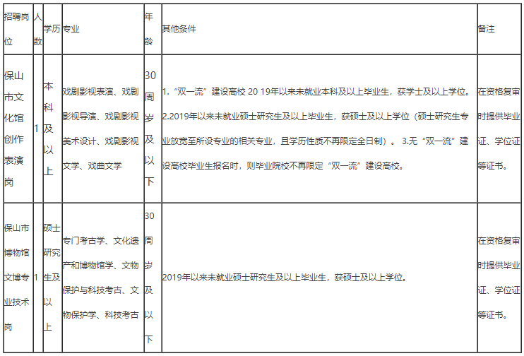 本次招聘岗位为保山市文化馆创作表演岗、保山市博物馆文博专业技术岗,每个岗位招聘人数1人,具体岗位要求如下: