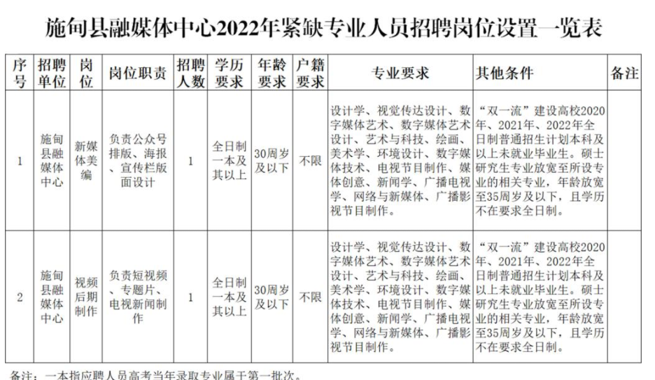 为切实加强宣传队伍建设,更好的发挥融媒体中心引导群众、服务群众的功能,根据《关于进一步规范我市事业单位到校园公开招聘工作人员有关事项的通知》(保人社联〔2020〕18号)精神,结合新闻宣传工作实际,经报请县委、县人民政府同意,现将施甸县融媒体中心2022年新闻紧缺专业人员招聘工作有关事项公告如下。