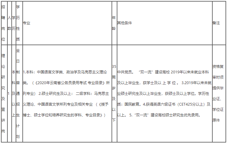 本次招聘岗位为保山新闻网站(市委讲师团)事业单位工作人员,招聘人数1名,具体岗位要求如下: