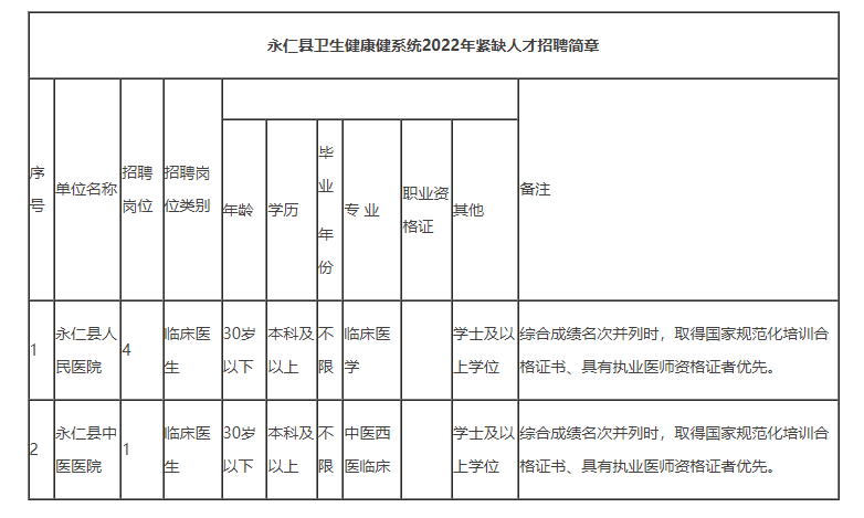 2022年,永仁县卫健系统招聘紧缺专业技术人才5名,其中:永仁县人民医院临床医学专业4名、永仁县中医医院中西医临床专业1名。
