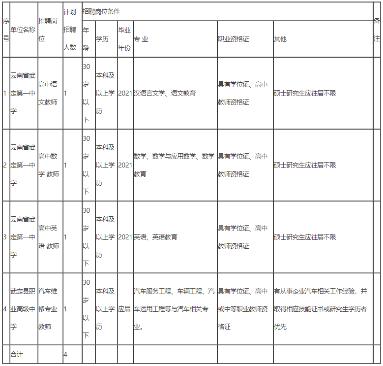 (一)应聘云南省武定第一中学人员须为2021年本科及以上学历毕业生(硕士研究生应往届不限),具有高中教师资格证;应聘武定县职业高级中学人员须为近三年本科及以上学历毕业生;
