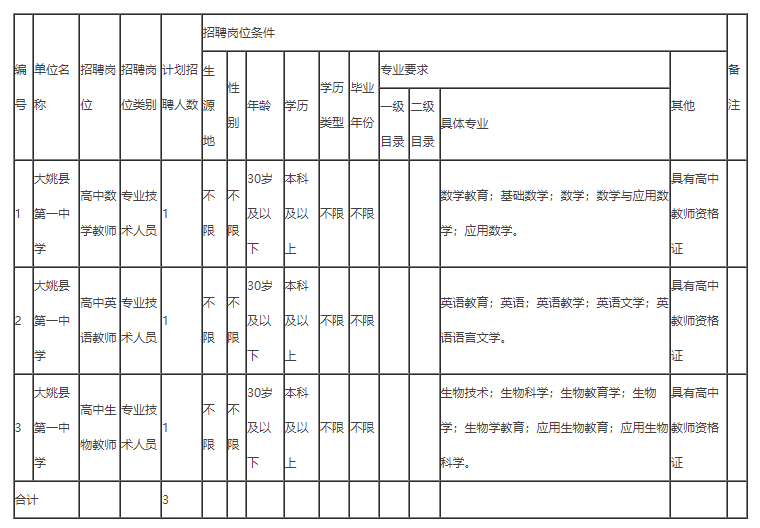 第二场计划招聘大姚县第一中学高中紧缺专业技术人才3名。具体为:数学教师岗位1名,英语教师岗位1名,生物教师岗位1名。详见《大姚县2022年高中紧缺专业技术人才第二场招聘岗位信息表》(附件1)。毕业证所载专业名称为**专业**方向或**(**)专业的,**方向或括号以内内容视作专业方向,专业方向不视为专业名称。岗位明确的专业为具体专业,本科及以上学历报考者所学的本科学历毕业证所载专业名称须和岗位明确的具体专业一致方可报考。