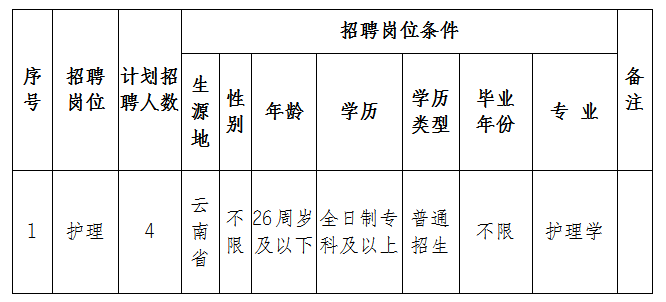 为进一步加强医院人才队伍建设,优化资源配置,创新服务模式,提高卫生人才队伍素质,满足人民群众日益增长的医疗卫生健康需求。结合我院工作实际,现面向社会公开招聘护理人员4名,相关事项要求如下:
