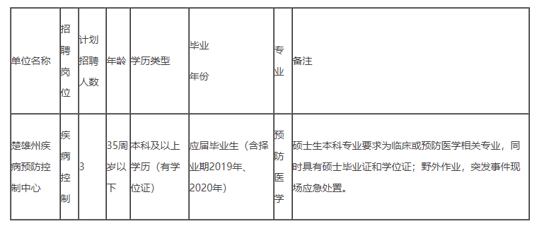 根据楚雄州人力资源和社会保障局《关于印发楚雄州事业单位公开招聘工作人员实施意见的通知》(楚人社发〔2013〕16号)精神,经楚雄州卫健委、楚雄州人社局同意,楚雄州疾病预防控制中心拟招聘紧缺人才3名,现将有关事项公告如下: