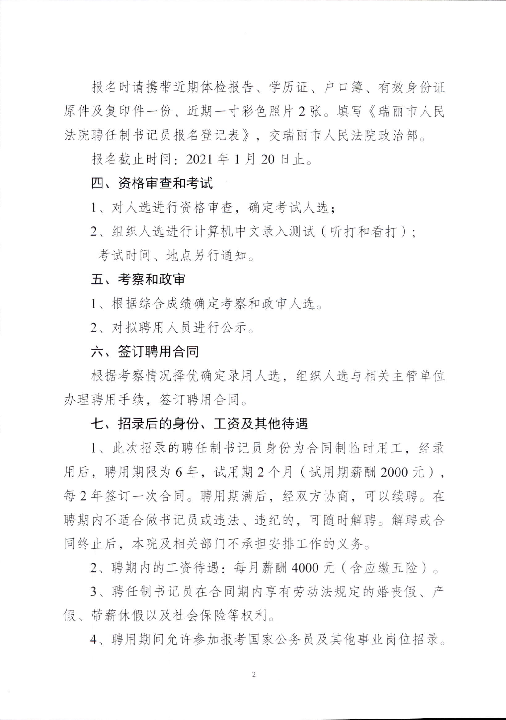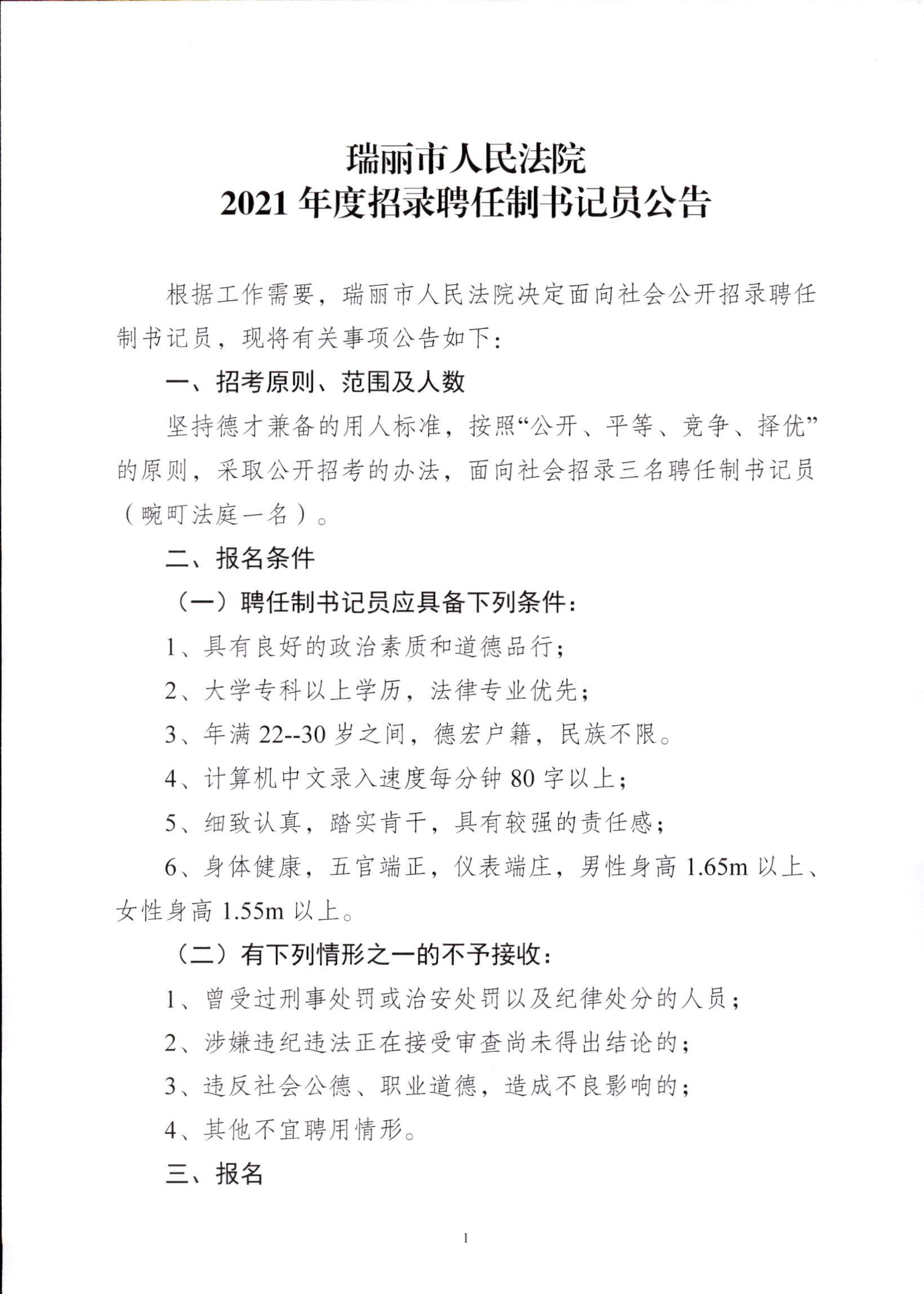 瑞丽市人民法院2021年度招录聘任制书记员公告