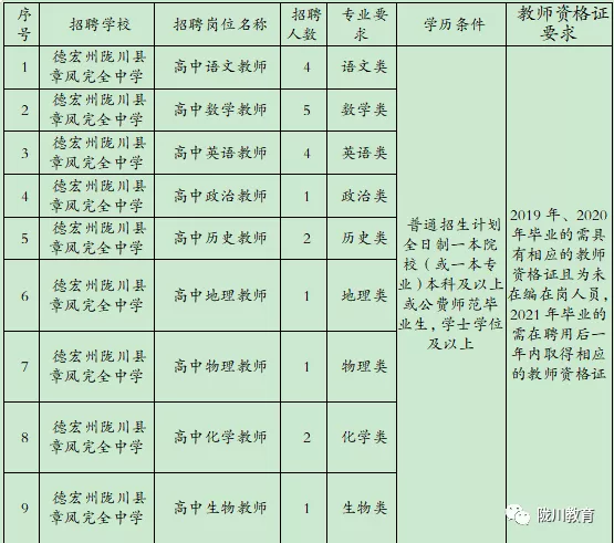 为进一步提高教育教学质量,加强教师队伍建设,按照中共德宏州委机构编制委员会办公室《关于同意2021年度陇川县部分事业单位选优的批复》文件要求,拟面向社会公开考核招聘紧缺专业学科优秀人才21名,现将相关事宜公告如下: