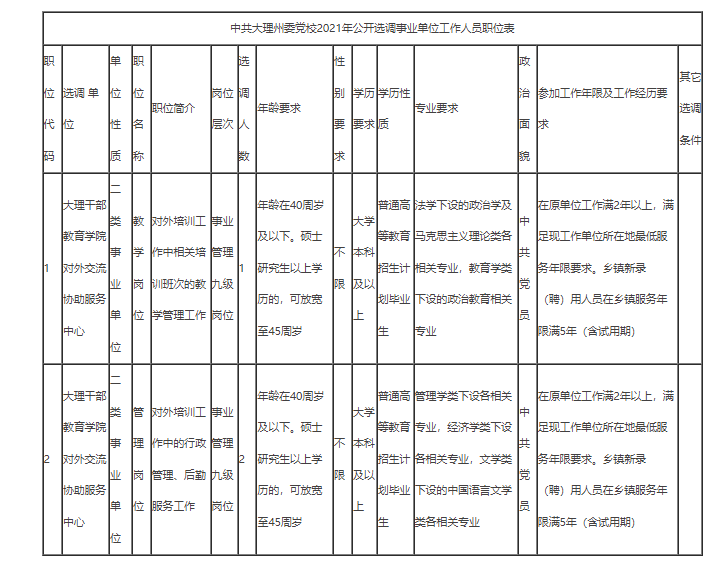 本次公开选调职位是中共大理州委党校下设二类事业单位“大理干部教育学院对外交流协作服务中心”的教学及管理岗位,选调岗位职数为事业单位管理九级,选调人数为3名。(详见《中共大理州委党校2021年公开选调事业单位工作人员职位表》)。