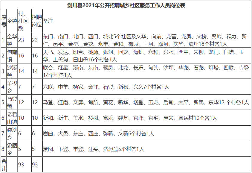 剑川县2021年城乡社区服务岗位招聘人数93名,全县每个村委会(社区)各1名,岗位设在社区或村民委员会。本次招聘城乡社区服务岗位,不属于在编人员,用人单位为各乡镇人民政府。具体招聘岗位及招聘条件详见《剑川县2021年公开招聘城乡社区服务工作人员岗位表》。