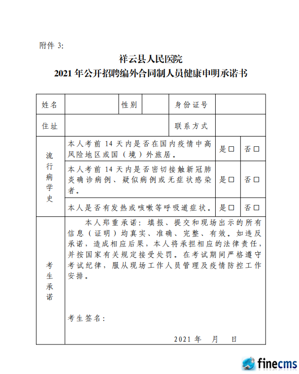 (二)如实填写《祥云县人民医院2021年公开招聘合同制人员个人健康信息承诺书》,并在报名时将个人健康信息承诺书交疫情防控相关工作人员。