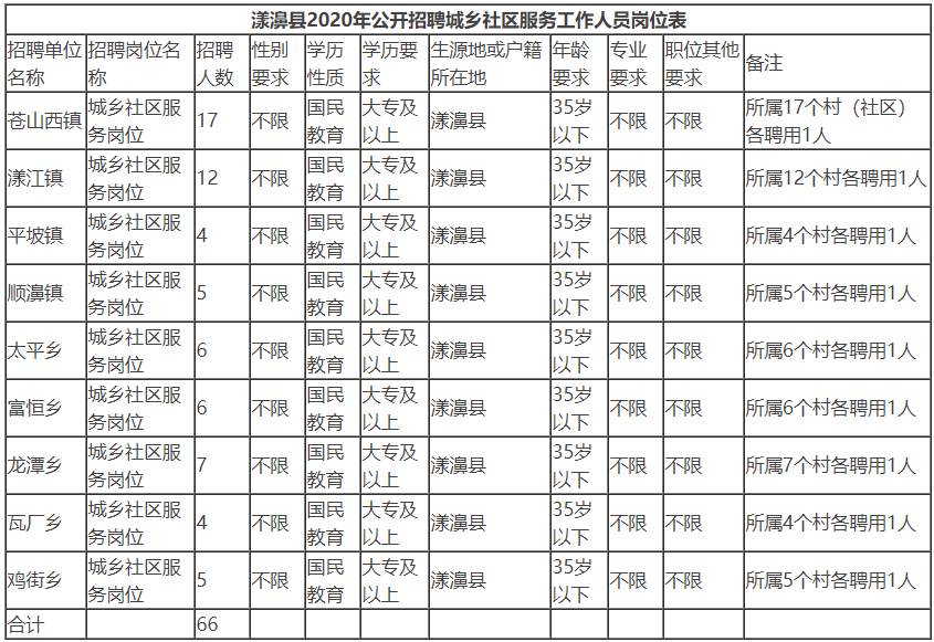 漾濞县2020年城乡社区服务岗位拟招聘人数66名,原则上全县每个村(社区)1名,岗位设在社区或村民委员会。本次招聘城乡社区服务岗位,不属于在编人员,用人单位为各乡镇人民政府。具体招聘岗位及招聘条件详见《漾濞县2020年公开招聘城乡社区服务工作人员岗位表》。