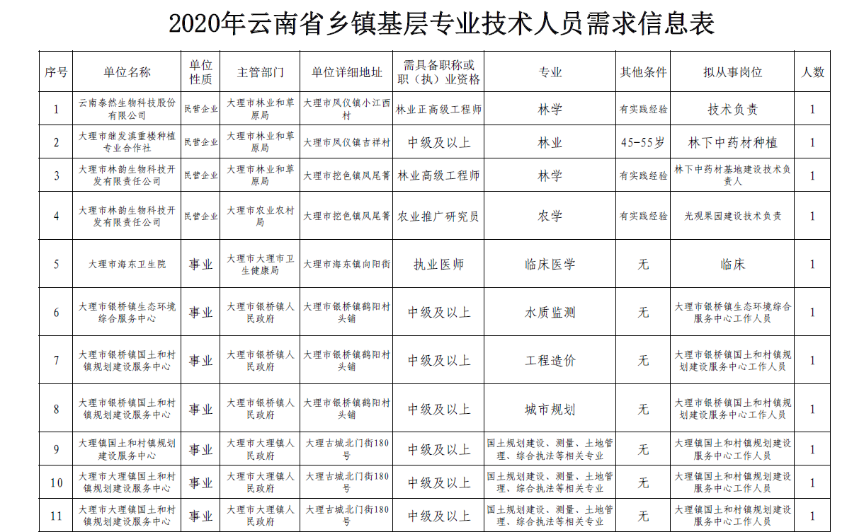 经广泛征集、筛选,大理市基层乡镇共28个岗位(具体岗位见附表)急需提供相应的专业技术服务,现予以公告。