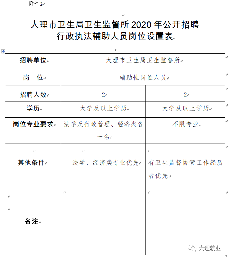 2.大理市卫生局卫生监督所2020年公开招聘行政执法辅助人员岗位设置表