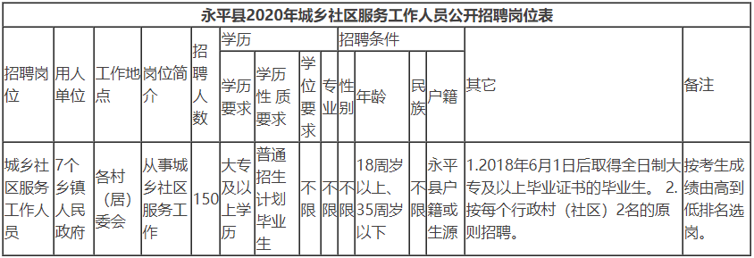 永平县2020年城乡社区服务岗位共招聘工作人员150名,原则上全县每个村(社区)2名,用人单位为各乡镇人民政府。具体招聘岗位及招聘条件详见《永平县2020年公开招聘城乡社区服务工作人员岗位表》。
