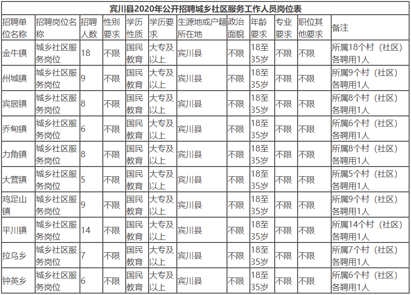 本次招聘岗位为城乡社区服务岗位,含城乡社区和行政村服务岗位,不属于在编人员,岗位设在城乡社区或村民委员会,由乡镇统一管理,按照每个行政村(社区)招聘1人的原则,共招聘90名城乡社区服务工作人员,招聘具体岗位见宾川县2020年公开招聘城乡社区服务工作人员岗位表(附件1)。