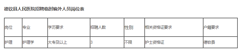 德钦县人民医院是德钦县唯一的二级综合医院,根据医院的发展和临床工作需要,决定面向社会公开招聘3名临时编外护理人员(具体详见岗位表),现将有关事项公告如下: