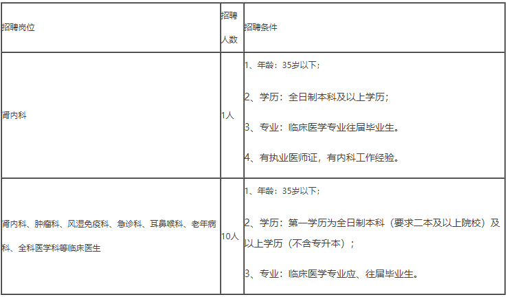 根据医院业务发展需求,现需招聘临床医生11人,具体招聘条件如下: