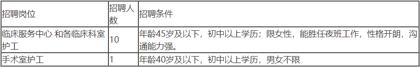 根据医院业务发展需求,我院临床服务中心、各临床科室和手术室需招聘11名护工,具体招聘岗位及条件如下:
