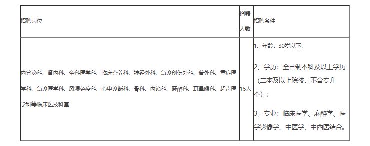 根据医院业务发展需求,现需招聘临床医生15人,具体招聘条件如下: