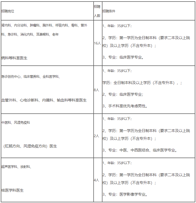 根据医院业务发展需求,现需招聘临床医生30人,具体招聘条件如下: