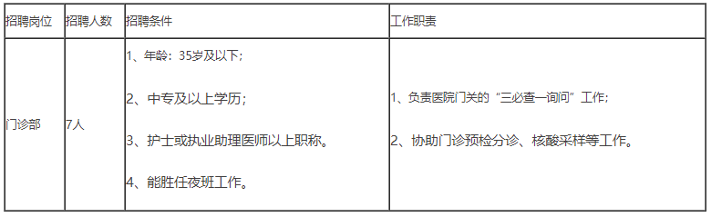 根据医院业务发展需求,我院门诊部需招聘工作人员7名,具体招聘条件如下: