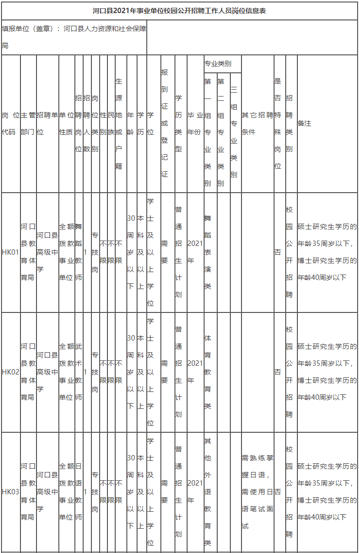 详见《河口县2021年事业单位校园公开招聘岗位信息表》(附件1)。