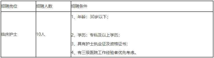 根据医院业务发展需求,现需招聘护理人员10人,具体招聘条件如下: