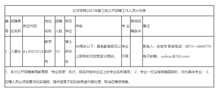 附件:1.红河学院2021年第三批公开招聘工作人员计划表