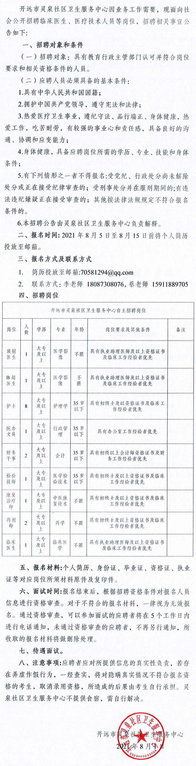 红河州开远市灵泉社区卫生服务中心2021年招聘公告如下: