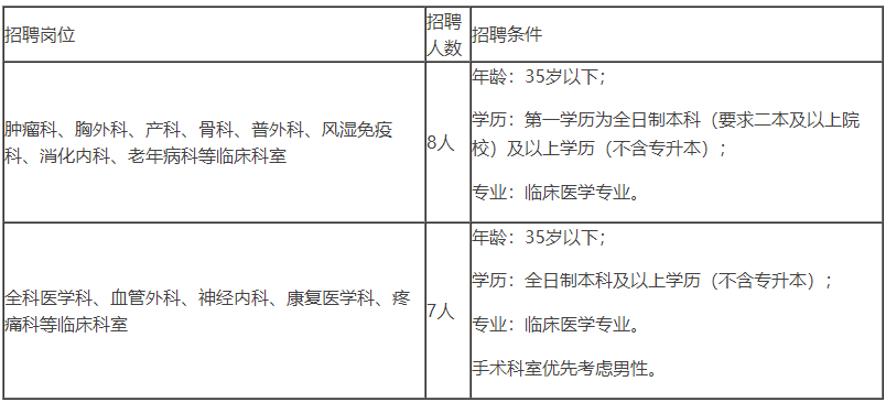 根据医院业务发展需求,我院肿瘤科、胸外科、产科等临床科室需招聘临床医师15名,具体招聘岗位及条件如下: