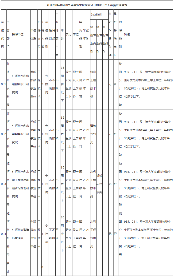 为进一步加强红河州水利人才队伍建设,改善人才队伍结构,提高服务能力,促进各项社会事业可持续发展,根据《事业单位人事管理条例》、《事业单位公开招聘人员暂行规定》、《云南省事业单位公开招聘工作人员办法》、《红河州事业单位紧缺人才招聘引进实施办法(试行)》、《红河州人力资源和社会保障局关于进一步做好红河州2021年事业单位紧缺人才招聘工作的通知》等有关规定,遵循“公开、平等、竞争、择优”的招聘原则,报经红河州人力资源和社会保障局批准,红河州水利局下属事业单位决定校园公开招聘工作人员8名,其中:红河州大型灌区管理局4人、红河州水利水电勘察设计研究院3人、红河州水利水电工程地质勘察咨询规划研究院1人。