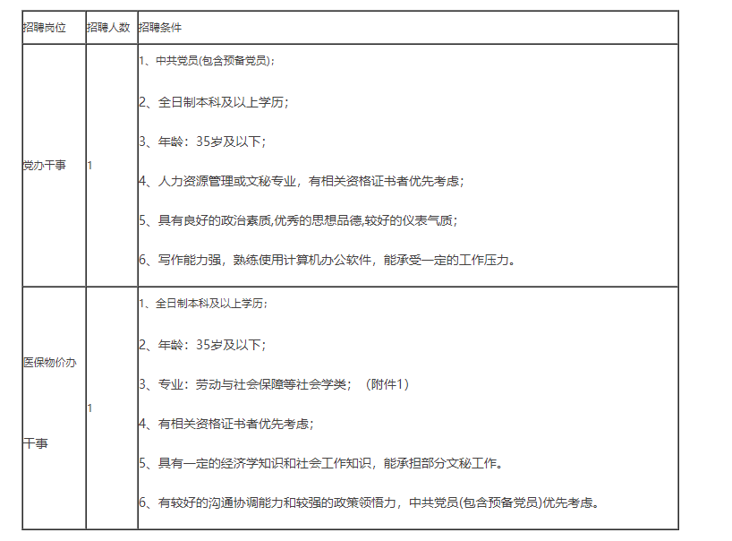 根据医院业务发展需求,现需招聘党办及医保物价办干事各1名,具体招聘条件如下: