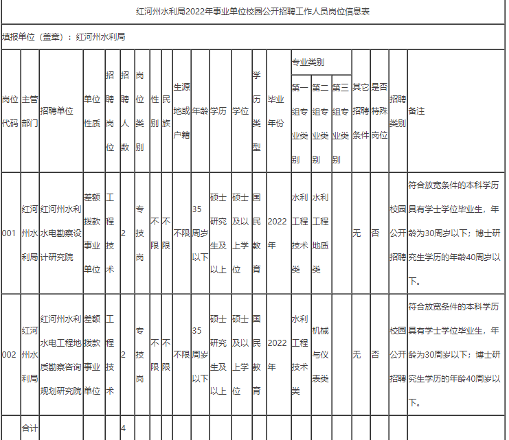为进一步加强红河州水利人才队伍建设,改善人才队伍结构,提高服务能力,促进各项社会事业可持续发展,根据《事业单位人事管理条例》、《事业单位公开招聘人员暂行规定》、《云南省事业单位公开招聘工作人员办法》、《红河州事业单位紧缺人才招聘引进实施办法(试行)》、《红河州人力资源和社会保障局关于进一步做好红河州2022年事业单位紧缺人才招聘工作的通知》等有关规定,遵循“公开、平等、竞争、择优”的招聘原则,报经红河州人力资源和社会保障局批准,红河州水利局下属事业单位决定校园公开招聘工作人员4名,其中:红河州水利水电勘察设计研究院2人、红河州水利水电工程地质勘察咨询规划研究院2人。