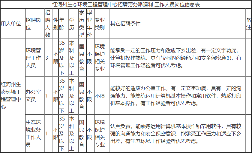 为进一步加强红河州生态环境人才队伍建设,促进红河州生态环境事业的可持续发展,根据人才招聘相关规定,遵循“公开、平等、竞争、择优”的考录原则,红河州生态环境工程管理中心拟面向社会公开招聘5名劳务派遣制工作人员,劳务派遣服务单位为红河州生态环境工程管理中心,现将招聘有关事宜公告如下: