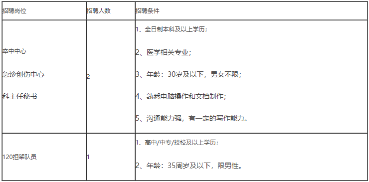 根据医院业务发展需求,我院卒中中心、急诊创伤中心、120需招聘工作人员3名,具体招聘条件如下: