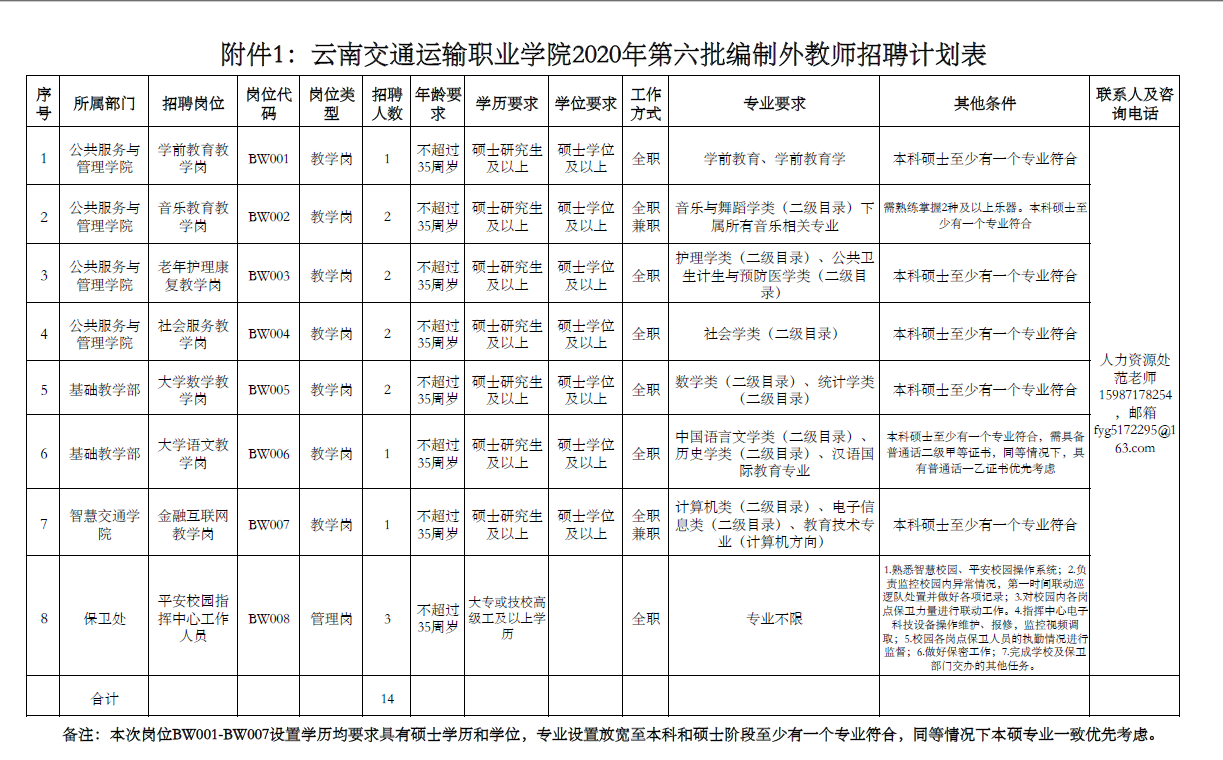 招聘岗位、专业及相关要求详见《云南交通运输职业学院2020年编制外教师招聘计划表》(附件1)和2020年云南省公务员考试专业目录(附件3)。报名时间:2020年9月30日8:00至10月5日18:00。