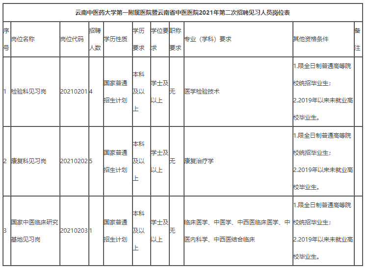 (一)岗位及条件:详见附件《云南中医药大学第一附属医院暨云南省中医医院2021年第二次招聘见习人员岗位表》。