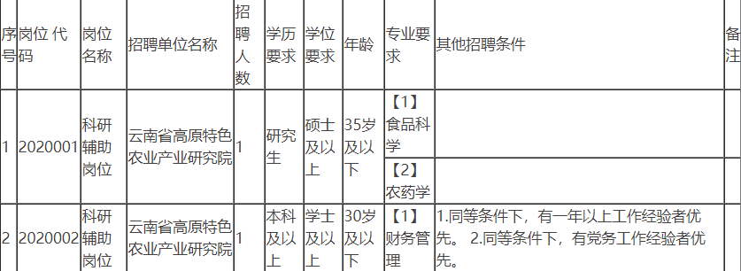 具体招聘岗位及招聘条件,详见《云南省高原特色农业产业研究院2020年公开招聘工作人员计划表》(附件1)。