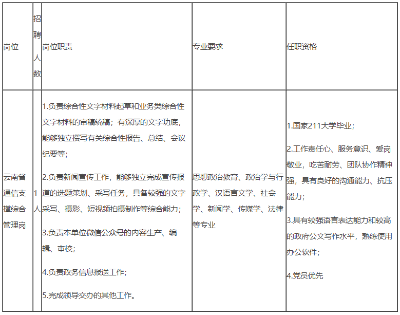 本次招聘的云南省通信支撑综合管理岗,主要负责协助云南省通信管理局工作。该岗位属于中国信息通信研究院劳动合同制管理的正式员工的职位,办公地点为云南省昆明市官渡区北京路136号。具体要求见下表: