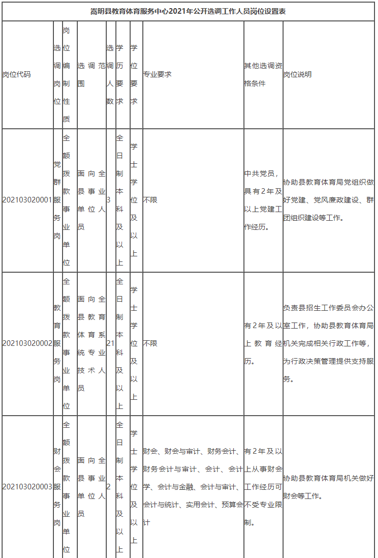 嵩明县教育体育服务中心2021年公开选调工作人员28名,公开选调岗位详见《嵩明县教育体育服务中心2021年公开选调工作人员岗位设置表》(附件1)。