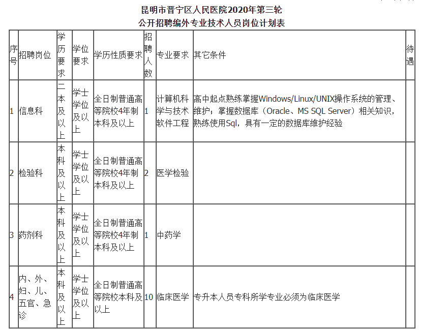 详见《昆明市晋宁区人民医院2020年第三轮公开招聘编外专业技术人员岗位计划表》。