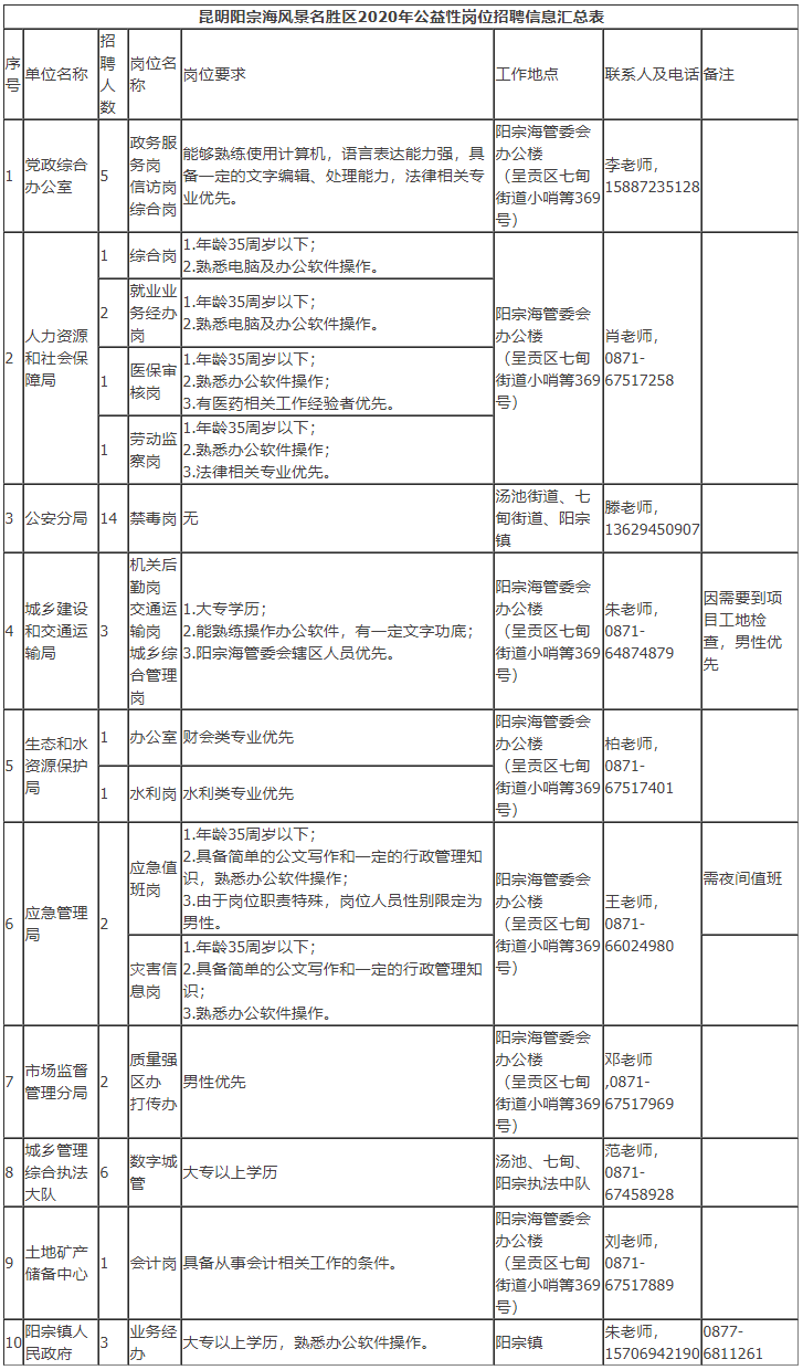 招聘岗位要求及报名事宜请咨询用人单位(联系方式见附表)。报名时间:工作日上午9:00-12:00,中午13:30-17:00。报名条件相关问题可咨询昆明阳宗海风景区管理委员会人力资源和社会保障局,联系人:黄老师,联系电话:67453200。