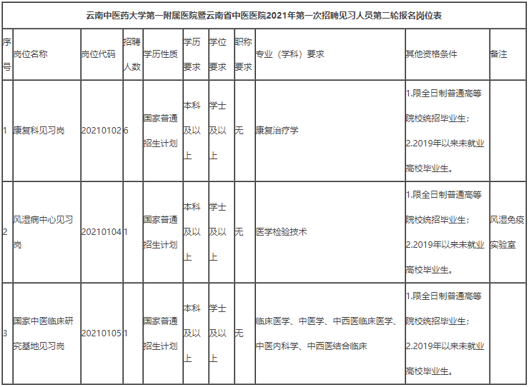 (一)岗位及条件:详见附件《云南中医药大学第一附属医院暨云南省中医医院2021年第一次招聘见习人员第二轮报名岗位表》。
