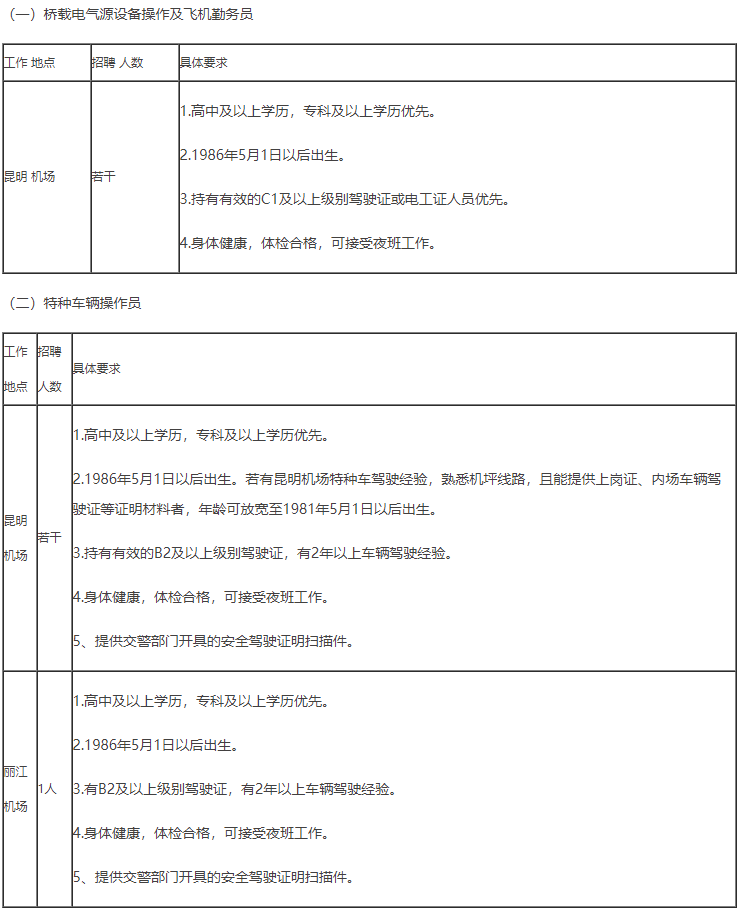 根据工作需要,公司决定面向社会公开招聘昆明长水机场特种车辆驾驶员、桥载电气源设备操作、飞机勤务员。现将有关事项公告如下: