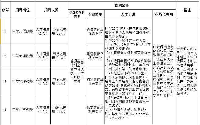 为加强学校教师队伍建设,引进优秀师资,进一步满足人民群众对优质教育资源的需求,根据我校教育教学工作需要,面向社会引进省内、外优秀中学教师共计4人(英语、地理、物理、化学教师各1人)、招聘市场化聘用教师4人(英语、地理、物理、化学教师各1人)。通过人才引进的教师均解决编制;符合市场化聘用条件的,按照市场化聘用办法办理聘用手续。现将有关事项公告如下:
