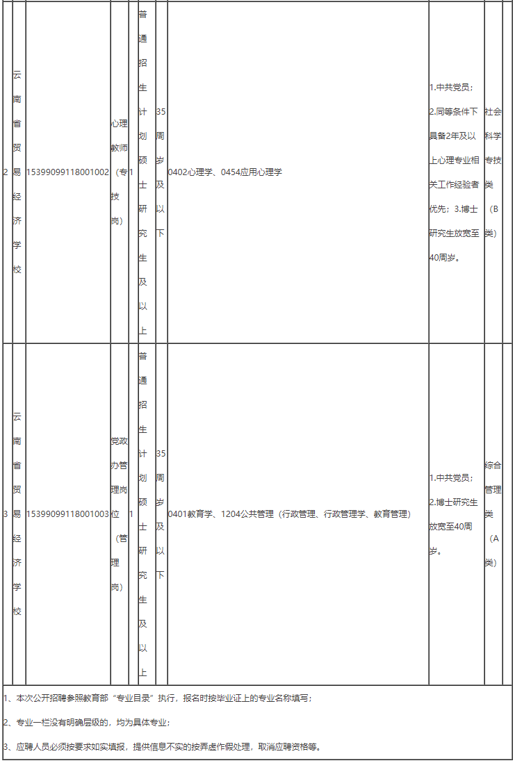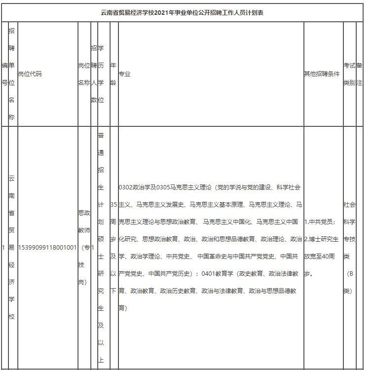 云南省贸易经济学校公开招聘工作人员3名,具体招聘岗位及招聘条件,详见《云南省贸易经济学校2021年公开招聘计划表》(附件1)。